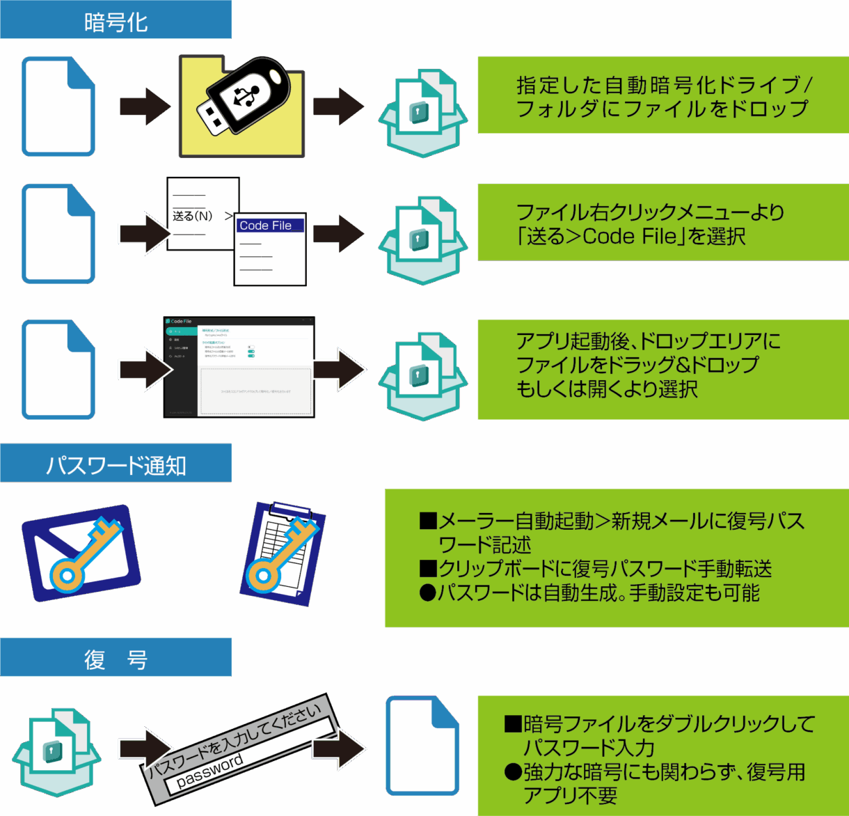 - 復号PCに解凍ソフトは必要なし! 復号パスワードだけで復号できる自己解凍型ファイル。