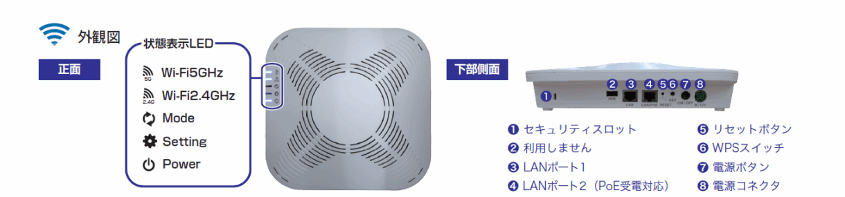 セキュリティその他 | SSID秘匿機能(Any接続拒否)、ゲストSSID※3、マルチSSID※4、プライバシーセパレータ、MACアドレスフィルタ、WPS※5(2.0互換)、DHCPサーバ※6、NTPサーバ※6 | |