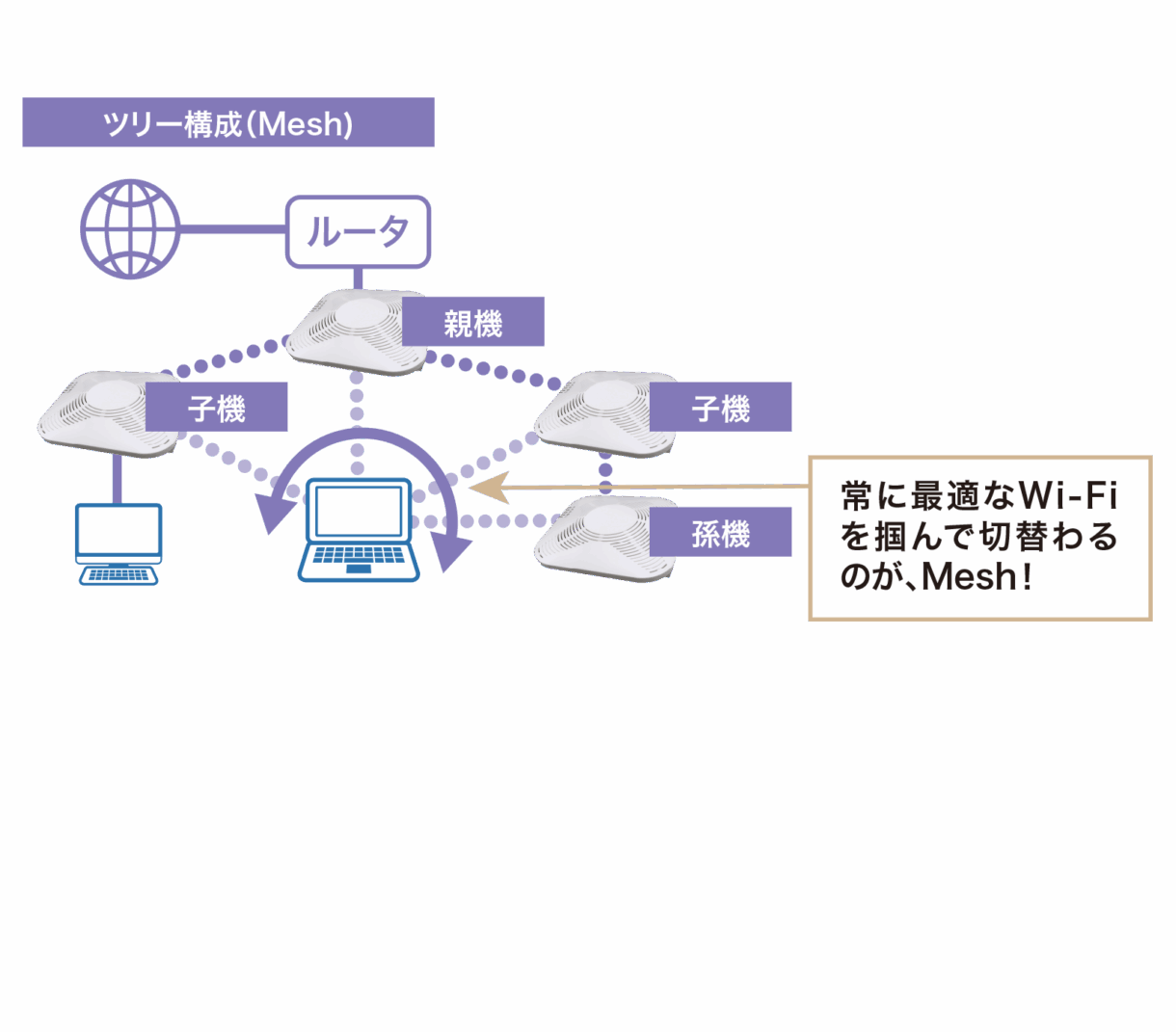 MeshとWDSは、ともにWi-Fiを挟んで、有線LAN機器を接続できる(中継)という点では一緒ですが、Meshは上流に向かって最適な経路になるようにWi-Fi端末の自動切り替えを行います。