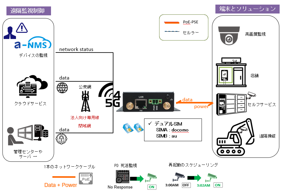 管理 | 設定装置:Web GUI、SSH システム:設定保存/復元、FWアップグレード PoE電力制御:状態監視による供給電源ON/OFF、スケジュールON/OFF |