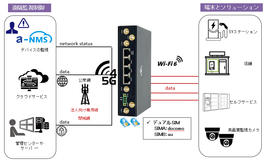 WAN機能 | WAN機能:セルラー & Ether-WAN、フェールオーバー セルラー:5G/LTE、IPv4/6 ネットワーク監視:ICMP/DNSチェッキング |
