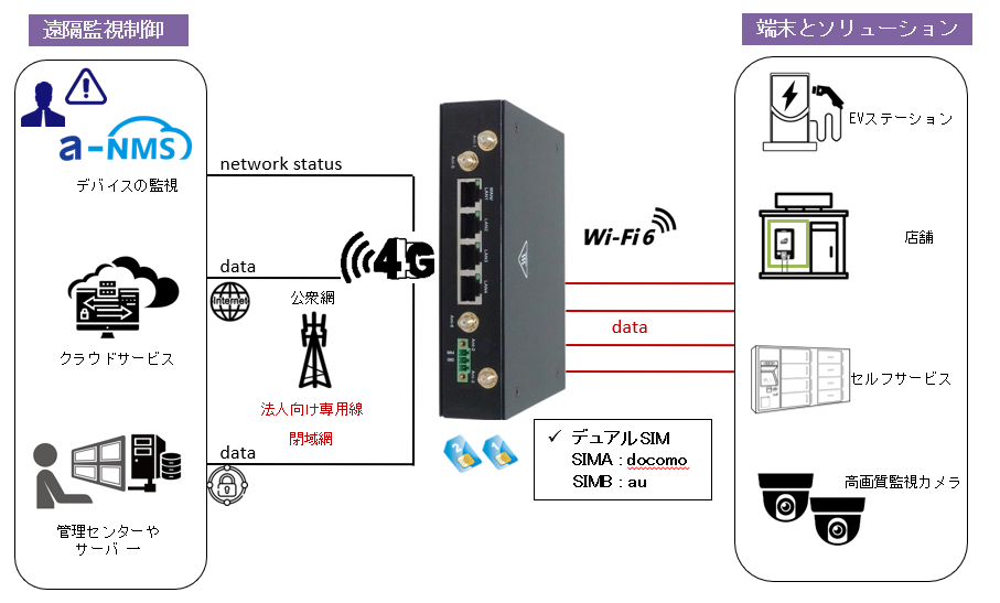 WAN機能 | WAN機能:セルラー & Ether-WAN、フェールオーバー セルラー:LTE、IPv4/6 ネットワーク監視:ICMP/DNSチェッキング |