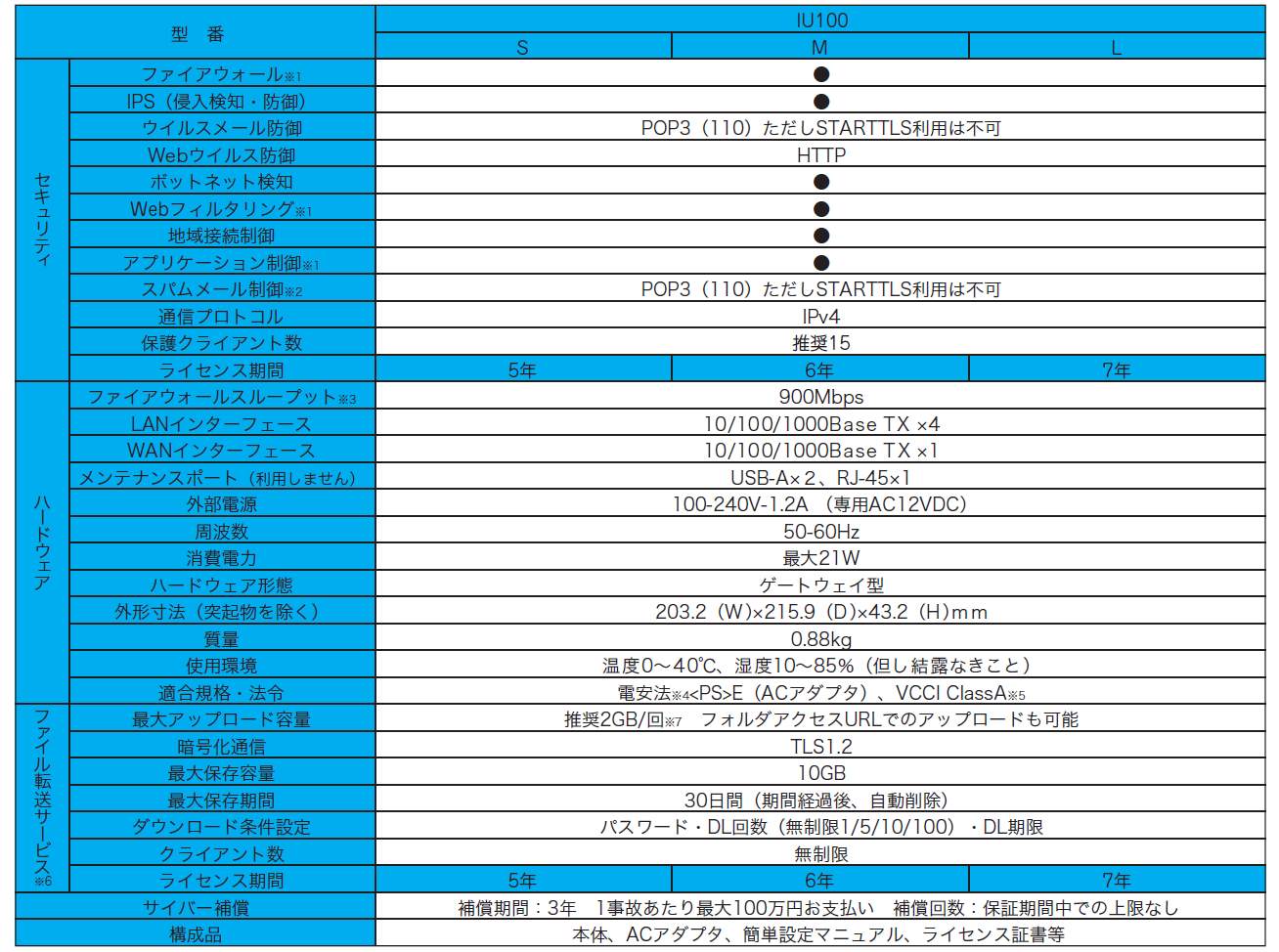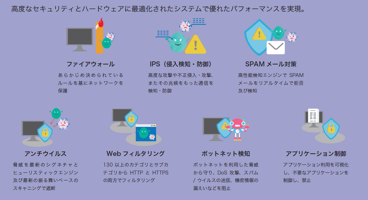 ●本資料記載の会社名および商品名等は、各社の商標または登録商標です。●本製品を医療機器の近くでは使用しないでください。●本資料は2026年3月現在のものです。製品改良等により仕様および内容は予告なく変更する場合があります。●本製品は機器構成によっては接続出来ない場合ありますので、あらかじめご了承ください。●本製品の故障・誤動作・不具合あるいは停電等の外部要因によって異常な動作が発生した場合や、異常動作の発生により生じた損害等の純粋経済損失につきましては、一切その責任を負いかねますので、あらかじめご了承ください。※1ユーザー様毎の設定が必要になります。 ※2 メール件名にSPAMマークが追加されます。※3 スループットは、実際の体感速度に近いIMIX値です。 ※4 電安法は、電気用品安全法の略語です。※5 VCCIは、VCCI協会が行う電磁妨害波の自主規制です。※6 アクセスURL(以下チケット)作成は1度に1ファイルまたは1フォルダとなります。一度に複数ファイルを送信する場合には、予め複数ファイルをZIPなどでまとめてアップロードしてください。また、ダウンロードのデータ合計が100MBを超えると正常にダウンロードできないことがあります。ファイルチケット作成の場合は100MB以下で作成してください。フォルダチケットを利用したアップロードの場合は、最大保存期間にご注意ください。※7 ご利用中の回線により、アップロードするファイルが2GBを超えるとアップロードに時間がかかる場合があります。